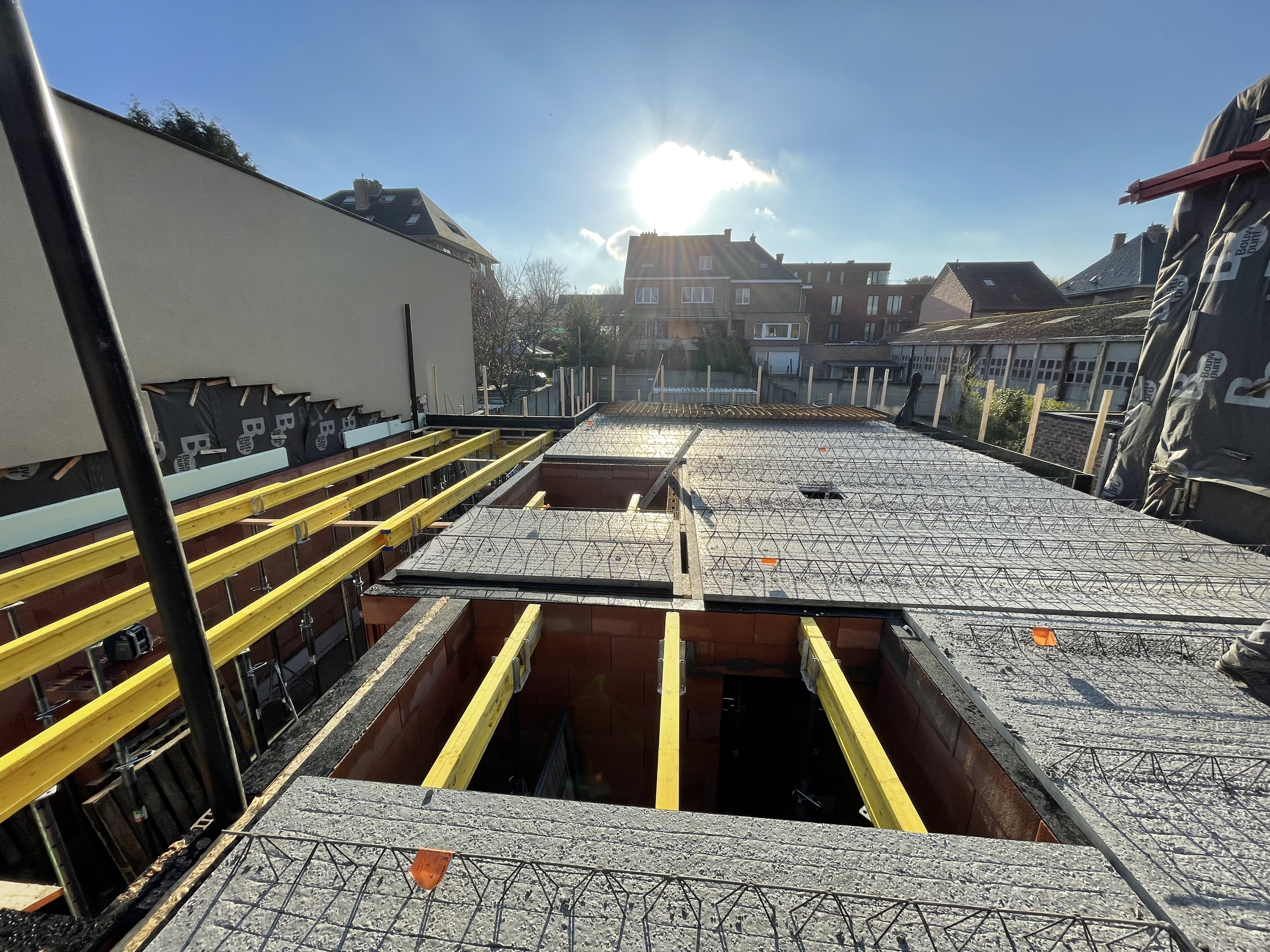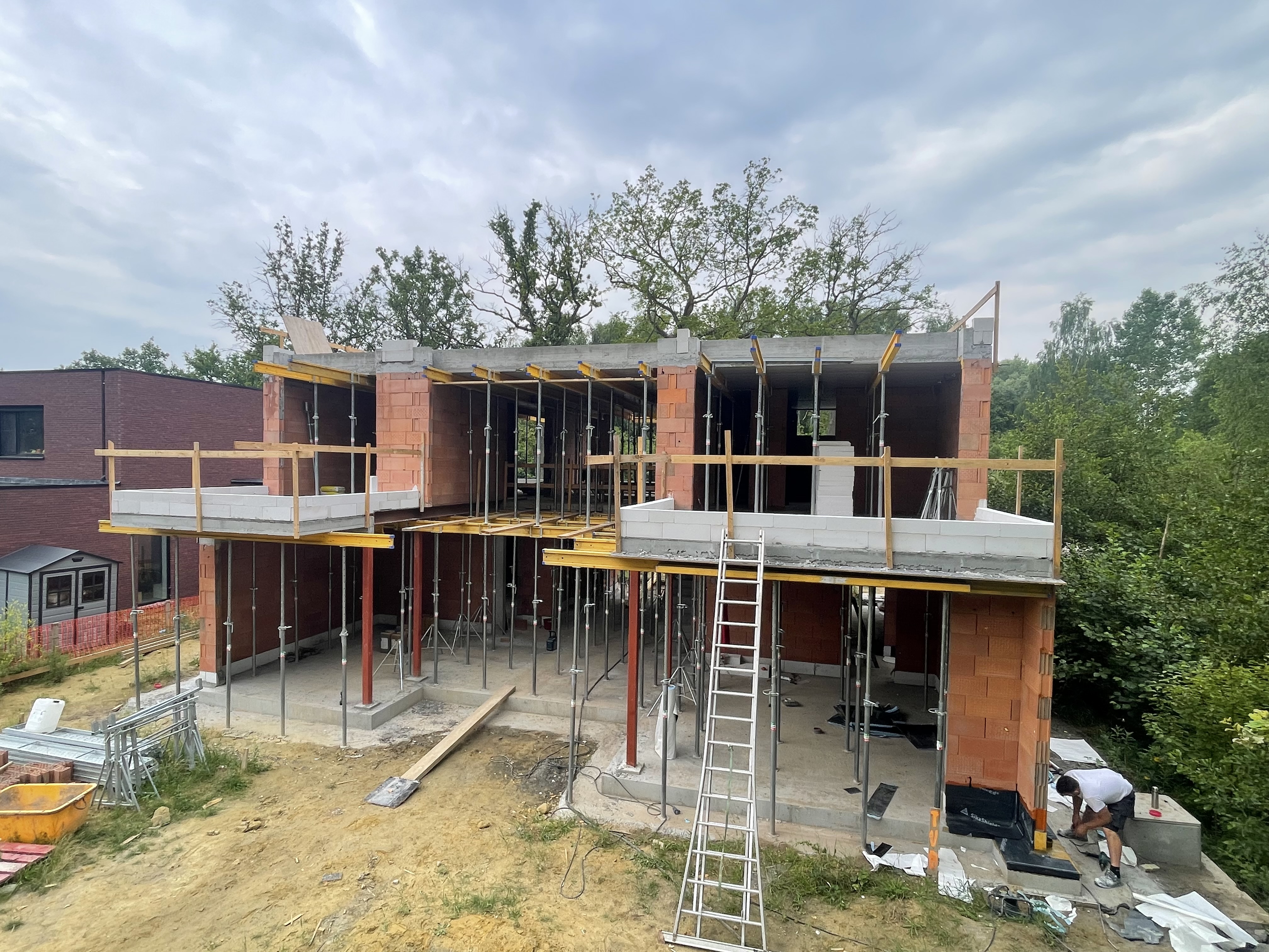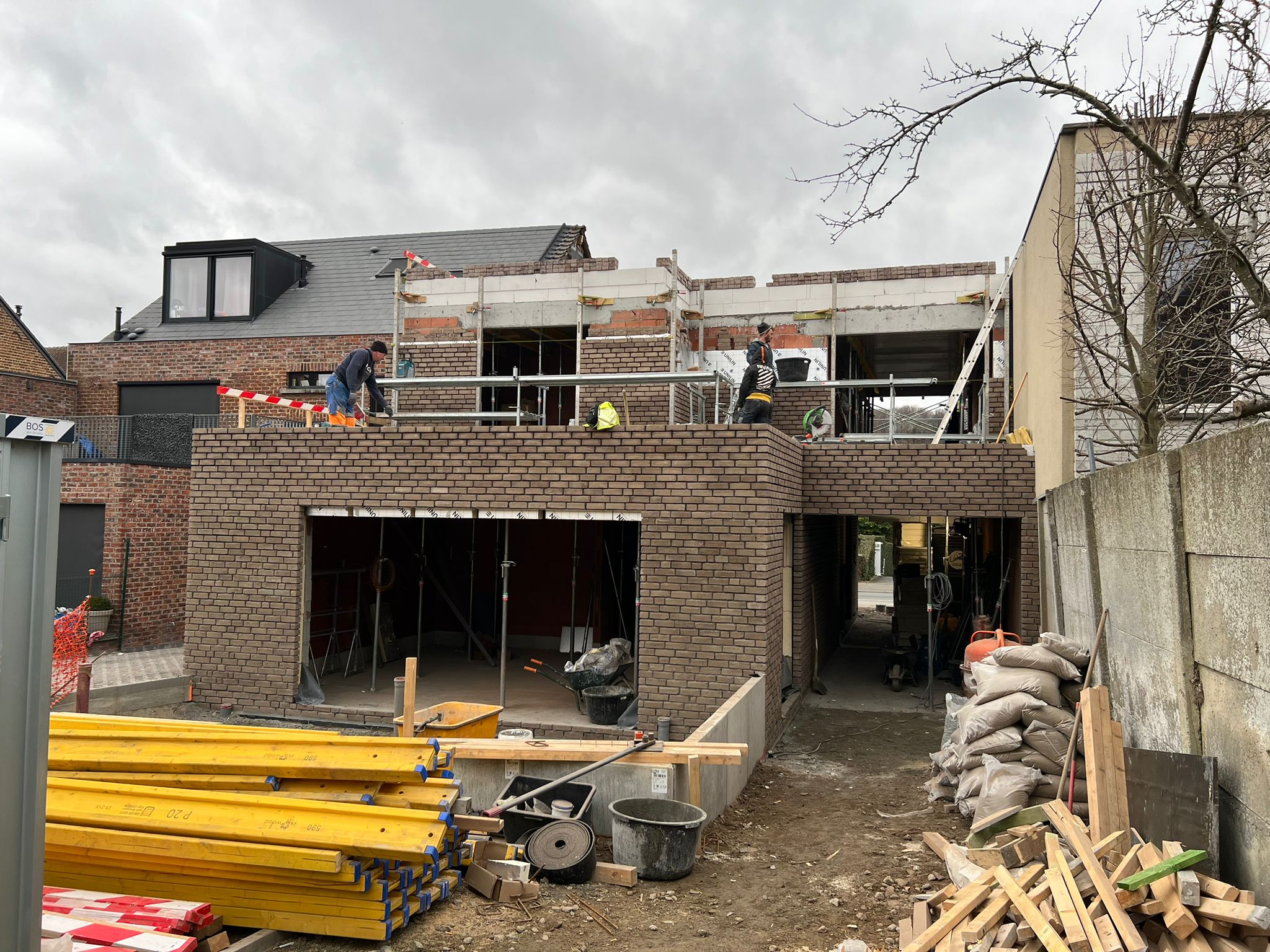 We starten met het uitzetten van de muren. Dan wordt het dragend- en binnen- metselwerk opgetrokken, uiteraard met de nodige vochtkeringen op de juiste plaats. Nadien wordt de voet van de fundering waterdicht gebrand met roofing of voorzien van epdm. De schoren en balken worden geplaatst voor het opleggen van de predallen om deze vervolgens te plaatsen, wapening te voorzien en een druklaag op de plaat te storten. De studs dienen een paar weken te blijven staan totdat het beton zijn volledige sterkte heeft gekregen. Eventueel wordt een trap ter plaatse gestort of een prefab trap voorzien. We proberen deze mee te storten met de druklaag van de plaat om de kosten van een pomp te beperken. De eerste verdieping en de volgende wordt volgens hetzelfde stramien gezet.