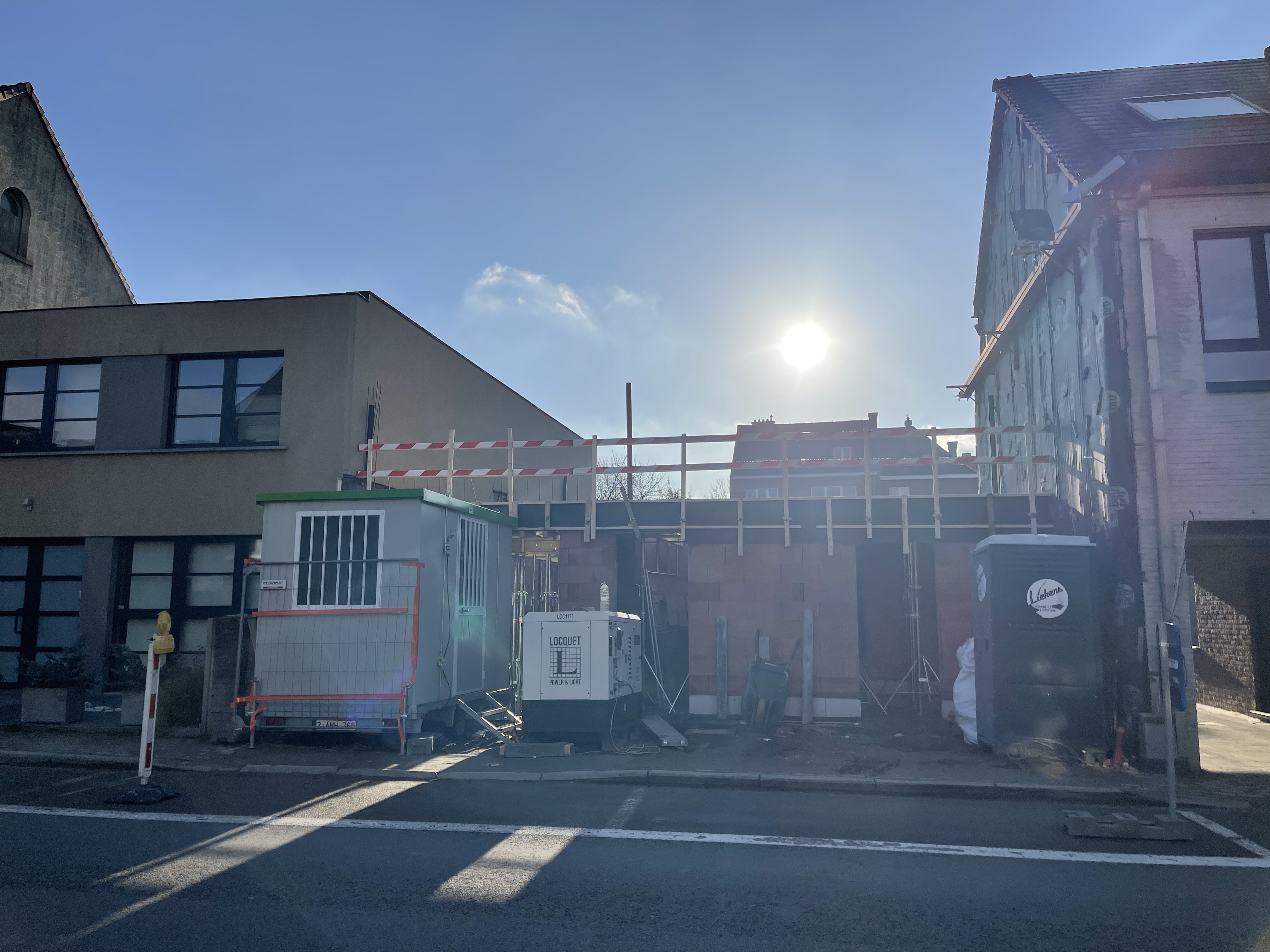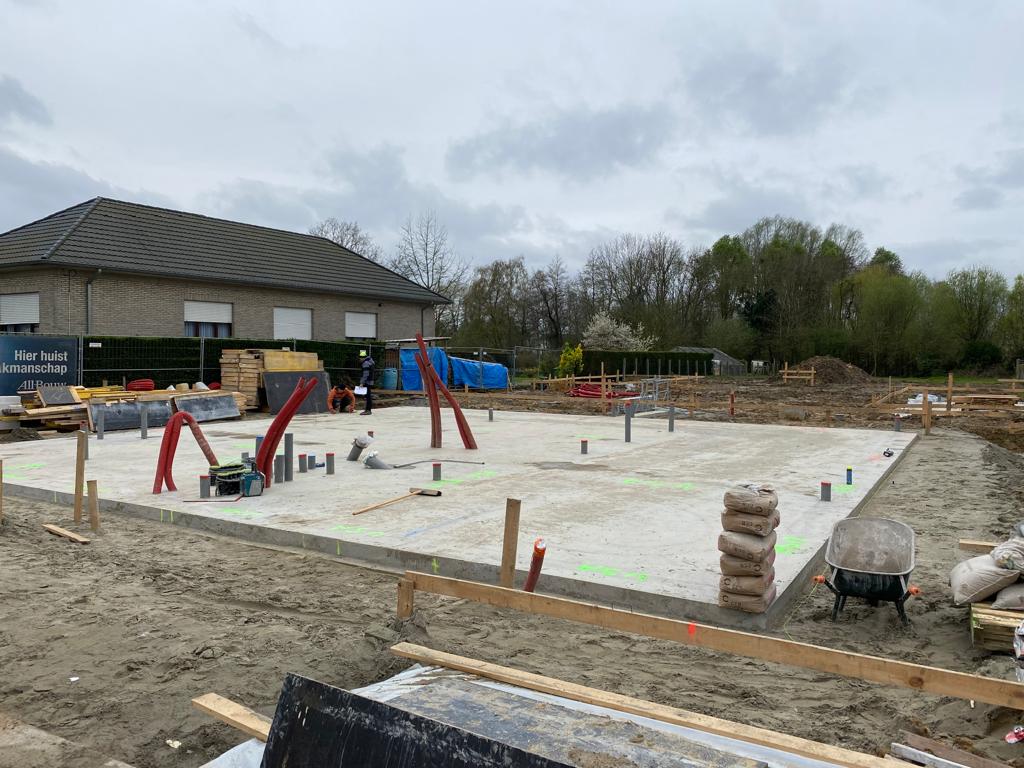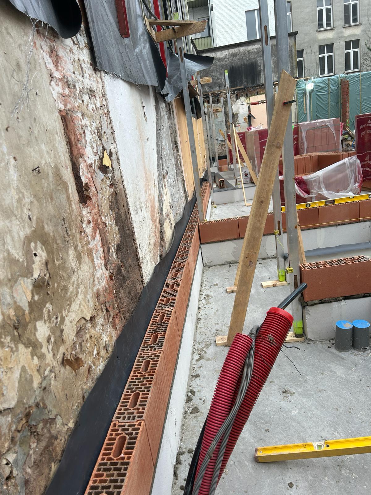 We starten met het uitzetten van de muren. Dan wordt het dragend- en binnen- metselwerk opgetrokken, uiteraard met de nodige vochtkeringen op de juiste plaats. Nadien wordt de voet van de fundering waterdicht gebrand met roofing of voorzien van epdm. De schoren en balken worden geplaatst voor het opleggen van de predallen om deze vervolgens te plaatsen, wapening te voorzien en een druklaag op de plaat te storten. De studs dienen een paar weken te blijven staan totdat het beton zijn volledige sterkte heeft gekregen. Eventueel wordt een trap ter plaatse gestort of een prefab trap voorzien. We proberen deze mee te storten met de druklaag van de plaat om de kosten van een pomp te beperken. De eerste verdieping en de volgende wordt volgens hetzelfde stramien gezet.